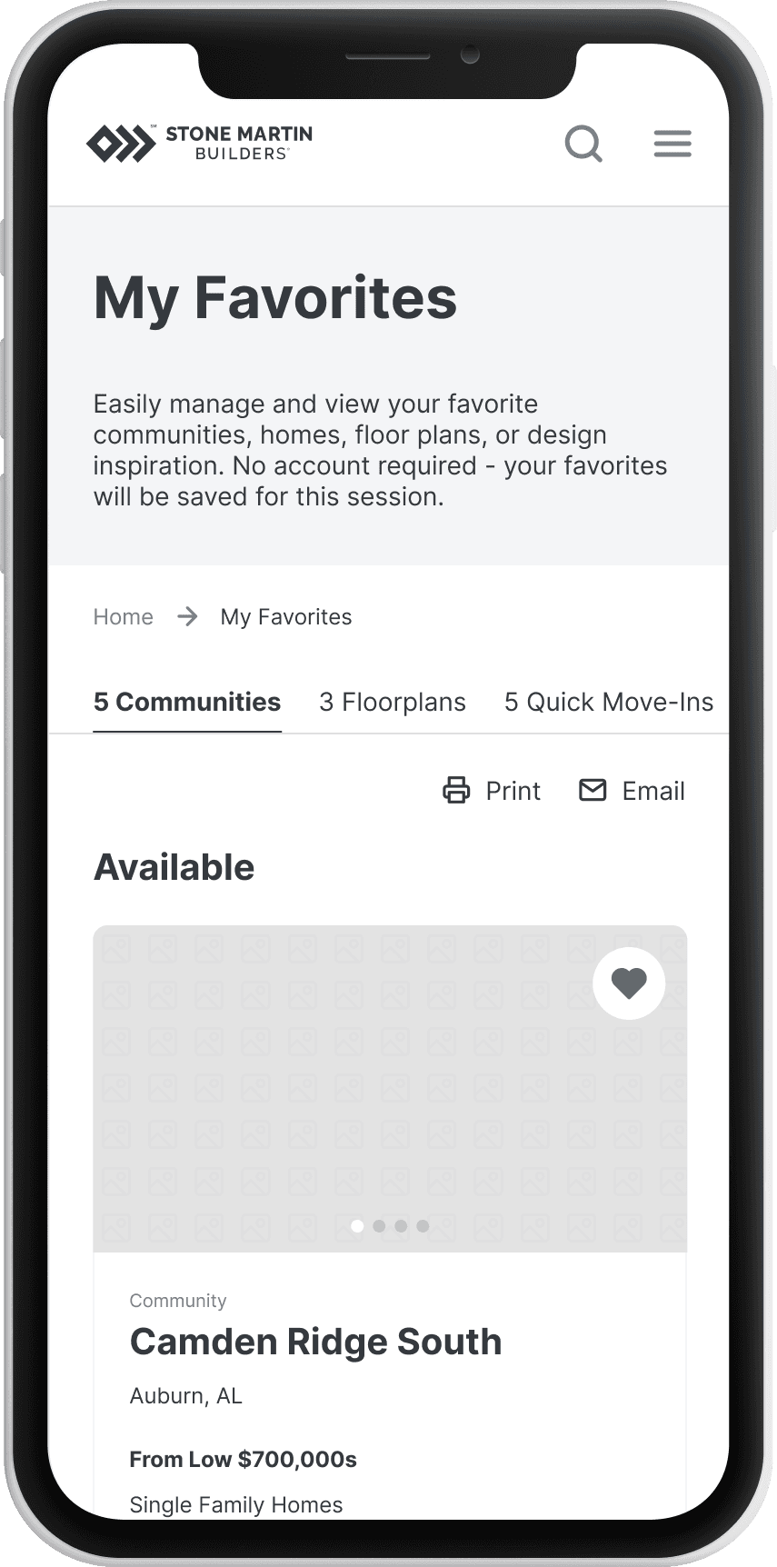 Lightweight feature to compare homes and share interests with family, friends, and even Stone Martin sales staff.
