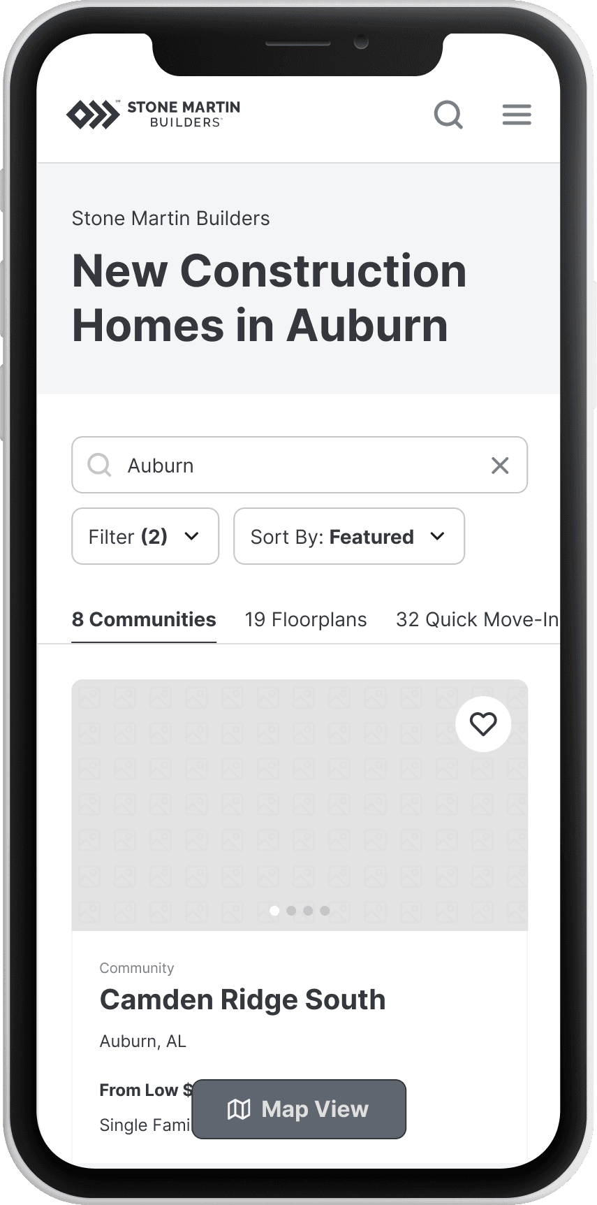 Enable seamless discovery of floorplans across a single Stone Martin community, and surface all communities where a given floorplan is available.